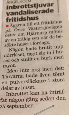 Es wurde zwar nichts gestohlen, jedoch erheblicher Sachschaden angerichtet: Alle Schlösser wurden aufgebrochen, sogar die der Toilette und des Schuppens. Alles schon schlimm genug, aber es wurde außerdem ein Pulver-Feuerlöscher in allen Zimmern verteilt. Das Entfernen des Pulvers hat eine Spezialfirma drei Tage beschäftigt.