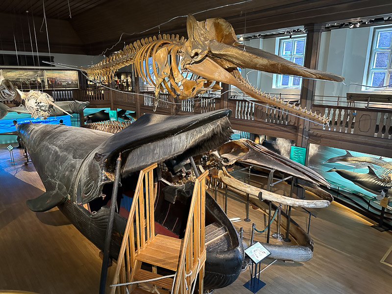 Ein Walskelett und darunter ein begehbarer Wal. Die Größe beeindruckt